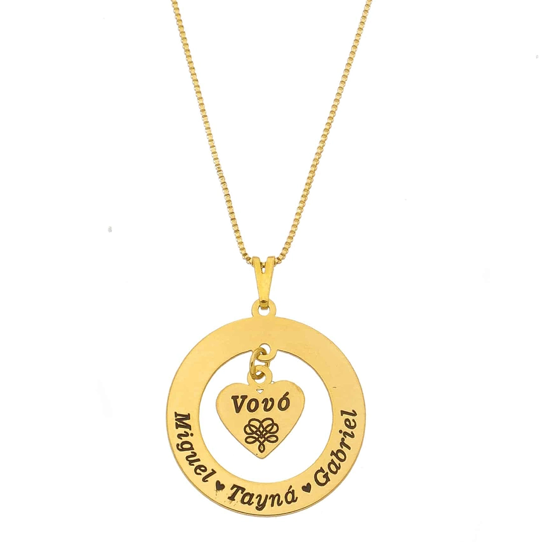 Lindo Colar Coração Vovó Personalizado. Com até 3 nomes gravados, pra quem quer expressar carinho e afeto, este colar é um presente perfeito para homenagear e eternizar o amor familiar com charme e sofisticação.