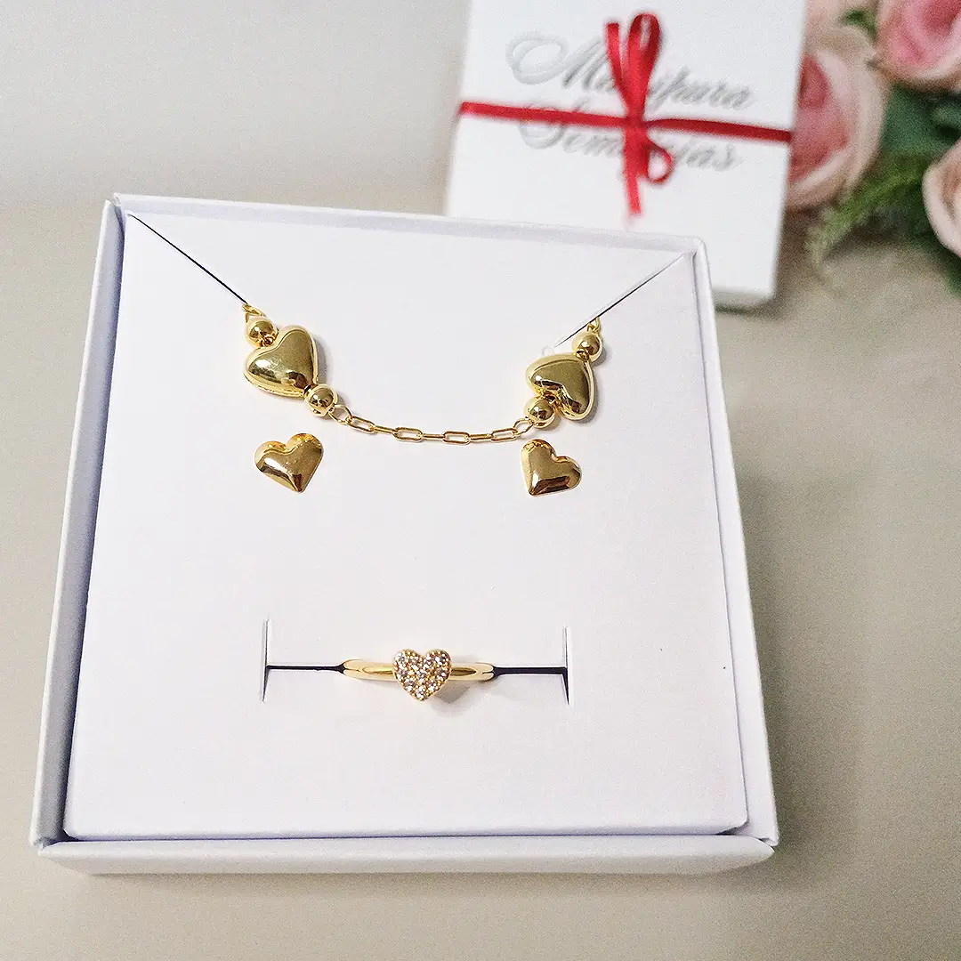 Delicado, sofisticado e repleto de charme, o Conjunto Coração é a escolha perfeita para quem ama acessórios românticos e atemporais. Banhado a ouro 18K, ele combina elegância e brilho na medida certa, proporcionando um toque especial ao seu visual. Seu design encantador faz dele um acessório versátil, ideal para diferentes ocasiões.