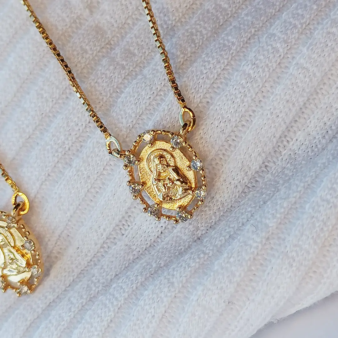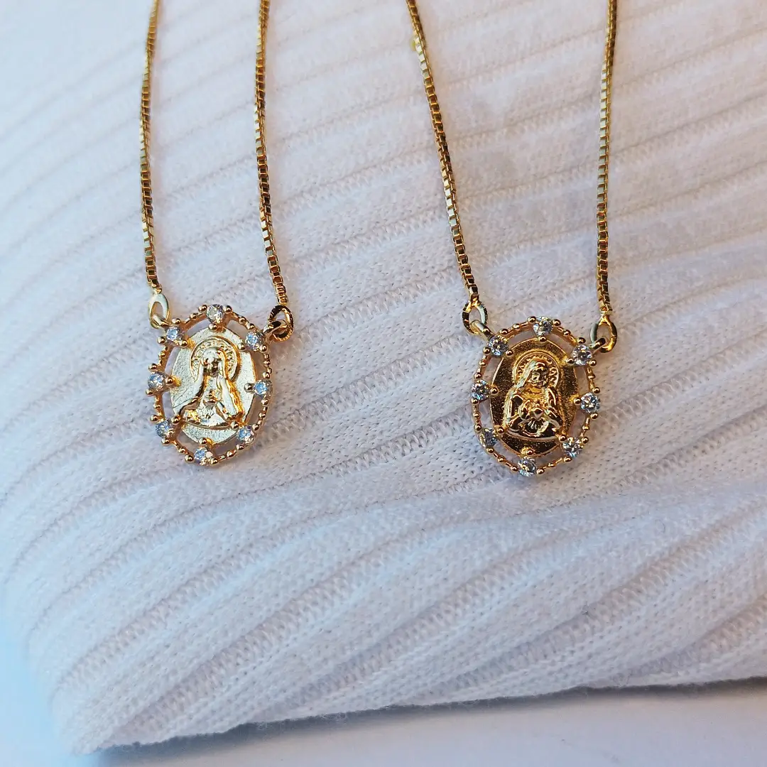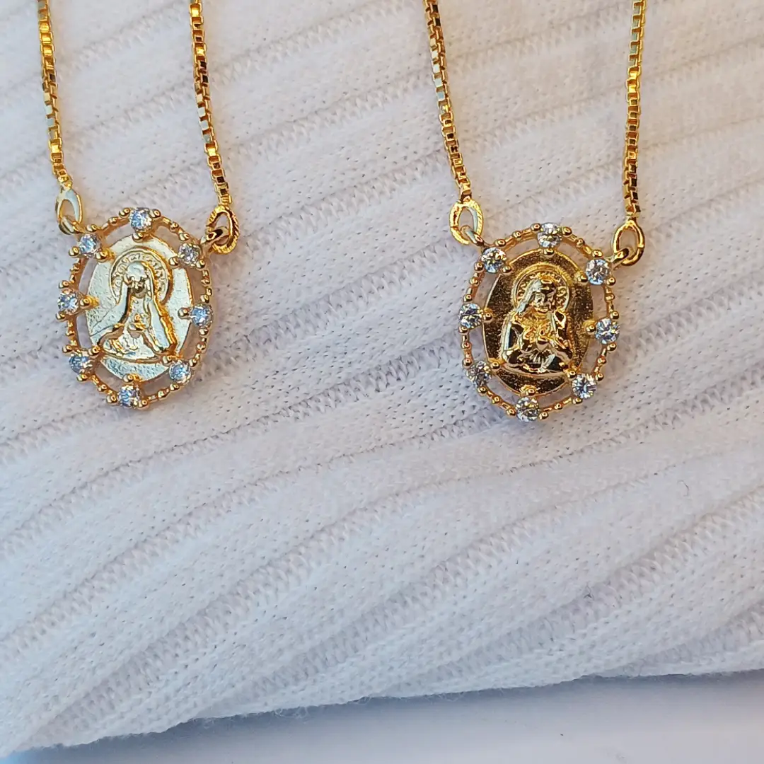 O Escapulário Sagrado Coração de Jesus é uma semijoia delicada, repleta de simbolismo, fé e elegância. Composto por duas medalhas ovais ricamente detalhadas, essa peça encantadora apresenta de um lado a imagem serena da Virgem Maria e, do outro, o Sagrado Coração de Jesus. Ambas as imagens são envolvidas por zircônias cristalinas, que adicionam brilho e valorizam ainda mais o visual sagrado da joia.