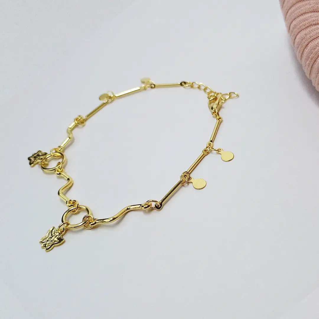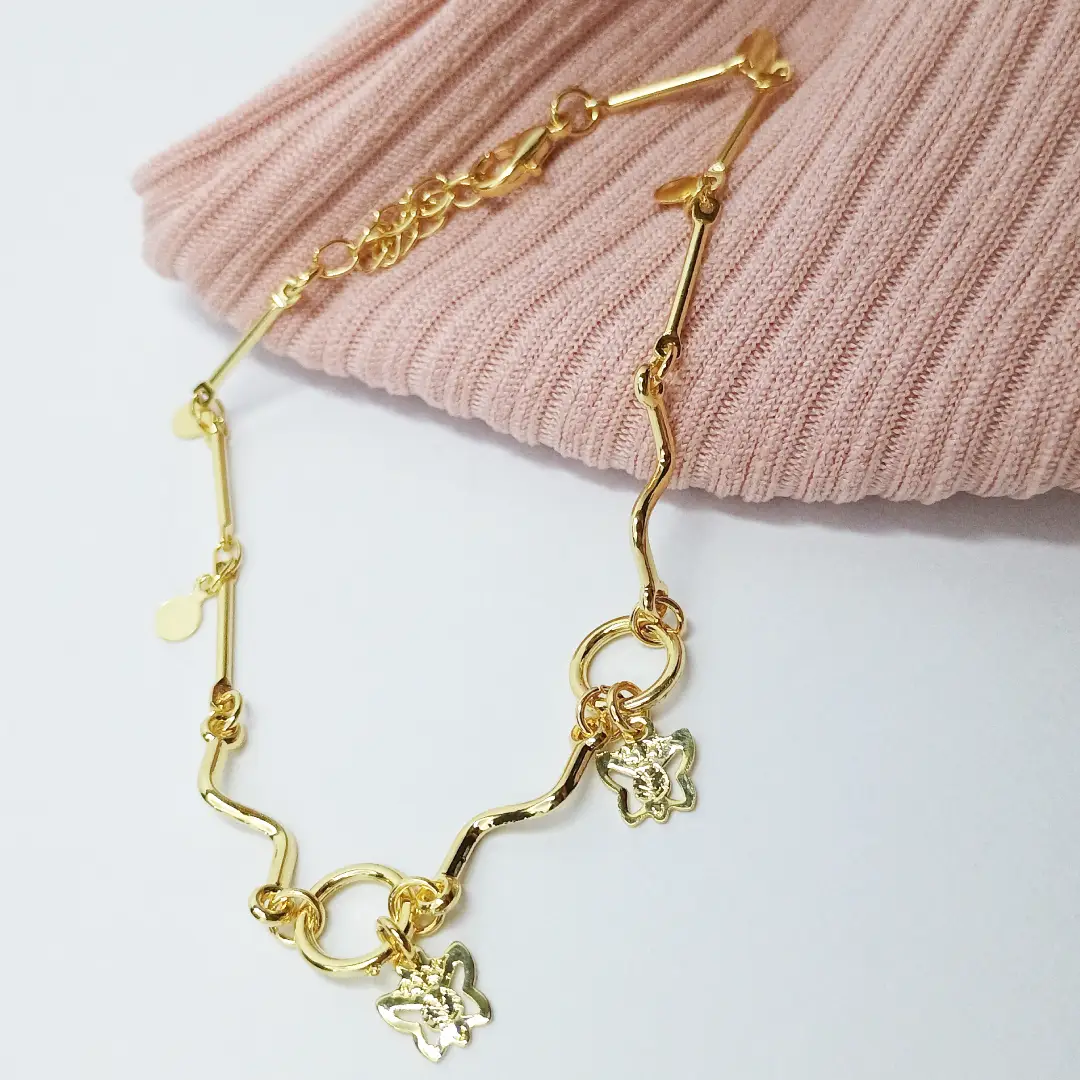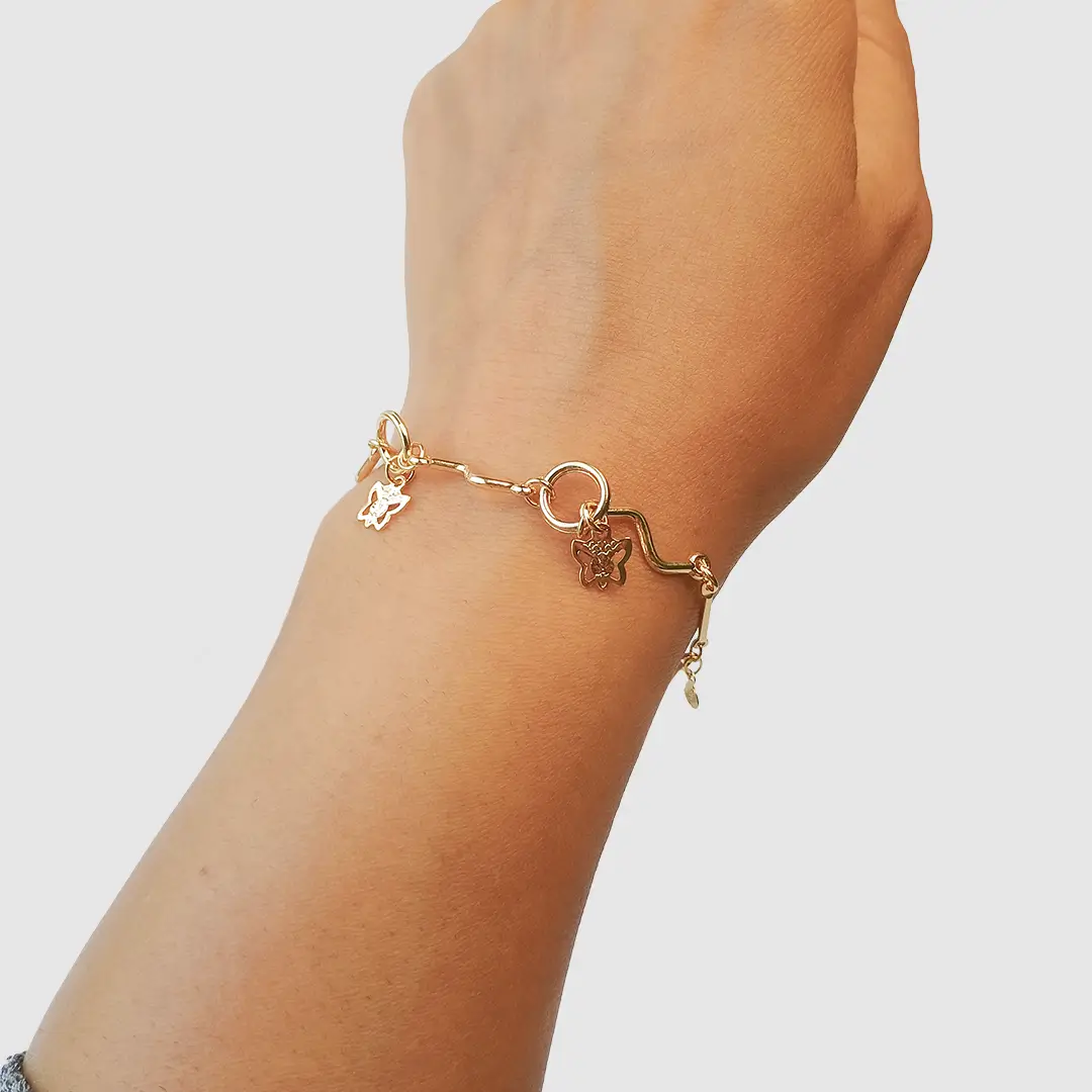 Delicada, cheia de charme e personalidade, a Pulseira Borboletas – Amália é uma joia que representa liberdade e feminilidade. Seu design alterna entre elos lisos e ondulados com pingentes de borboletas e discos dourados que criam um movimento leve e encantador. É banhada a ouro 18K, trazendo um brilho sofisticado para o seu visual.