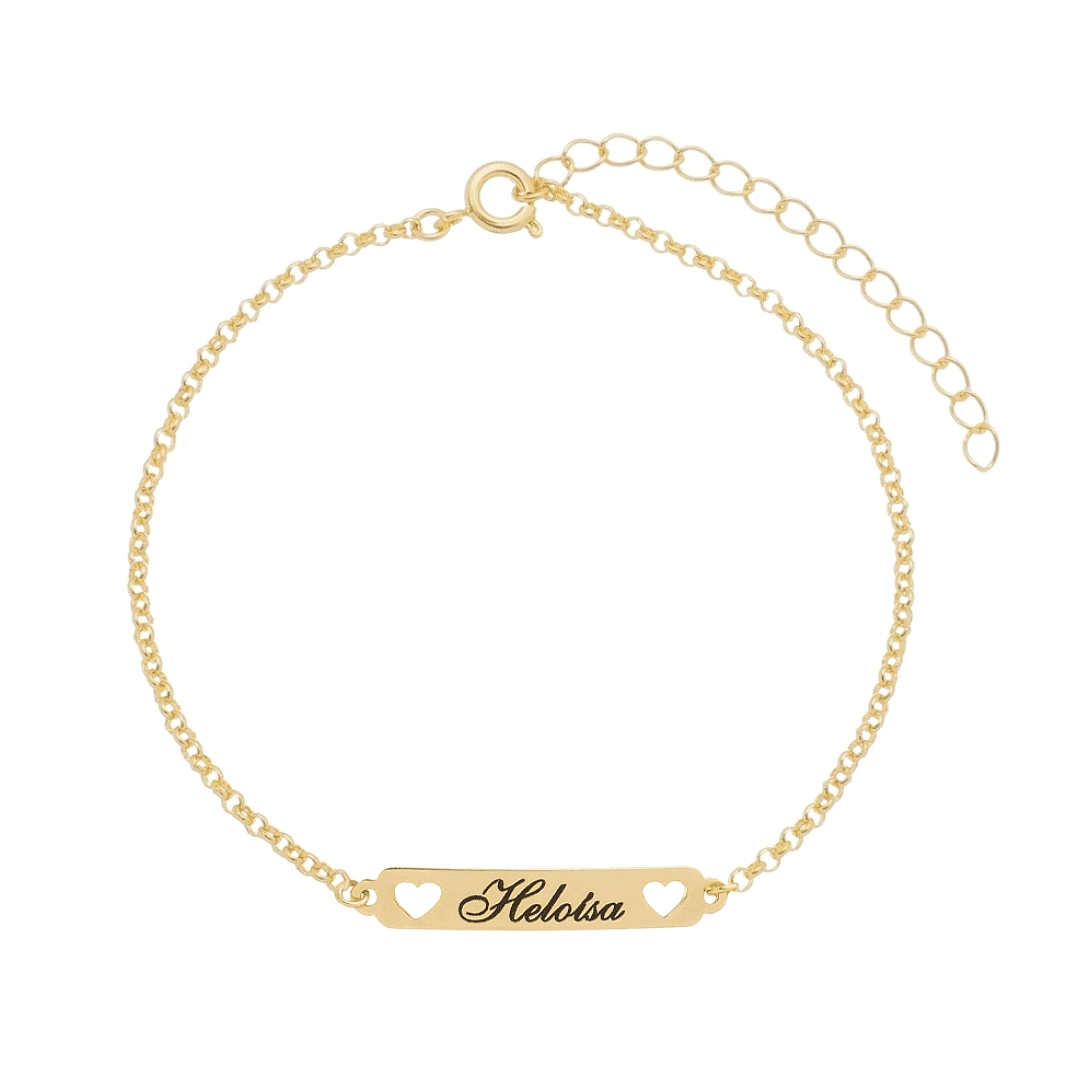 Encante-se com a Pulseira Infantil Coração Personalizada. Com uma plaquinha personalizada gravada com o nome da sua pequena, essa perfeição é desenhada com um coração vazado no início e no final da pulseira, trazendo um toque de delicadeza. Os detalhes em resina acrescentam cor e brilho, tornando a semijoia perfeita para presentar.